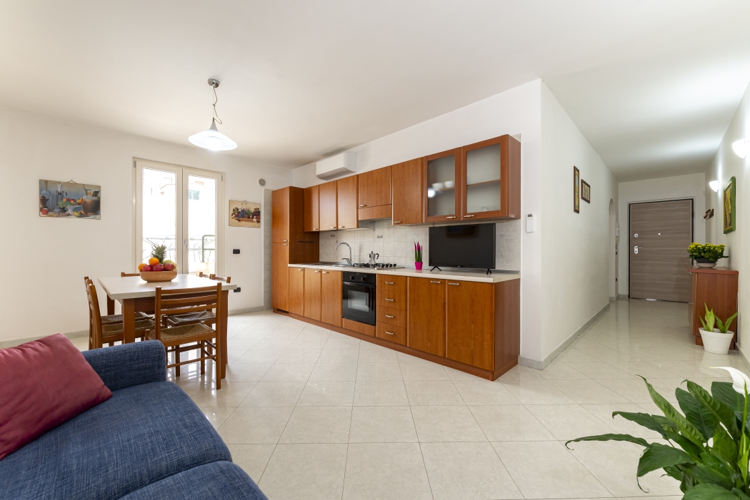 Appartamento di 75 mq caratterizzato da un grande terrazzo - solarium dotato di tavolo, di cui fruire anche per piacevoli pranzi all’aperto. Situato al primo piano, è composto da una camera letto matrimoniale, una seconda camera da letto con 4 letti ed un ampio soggiorno con divano e cucina.